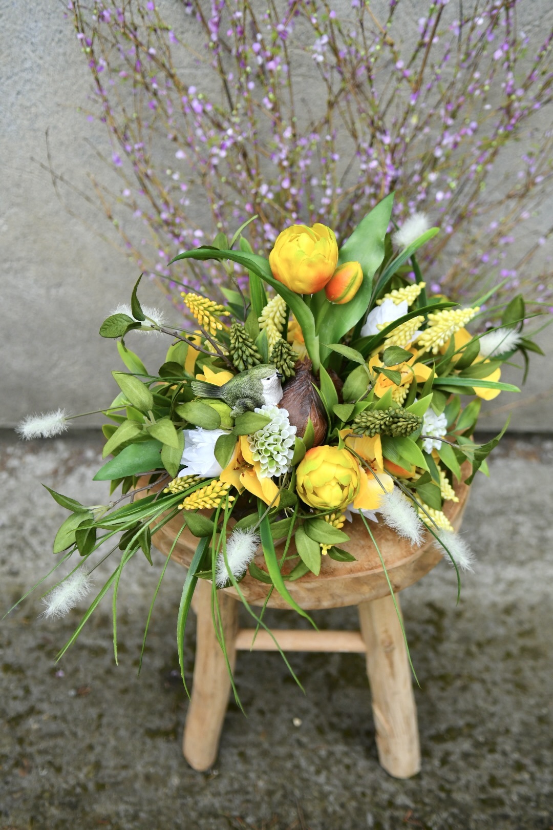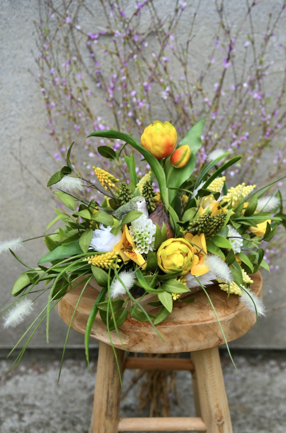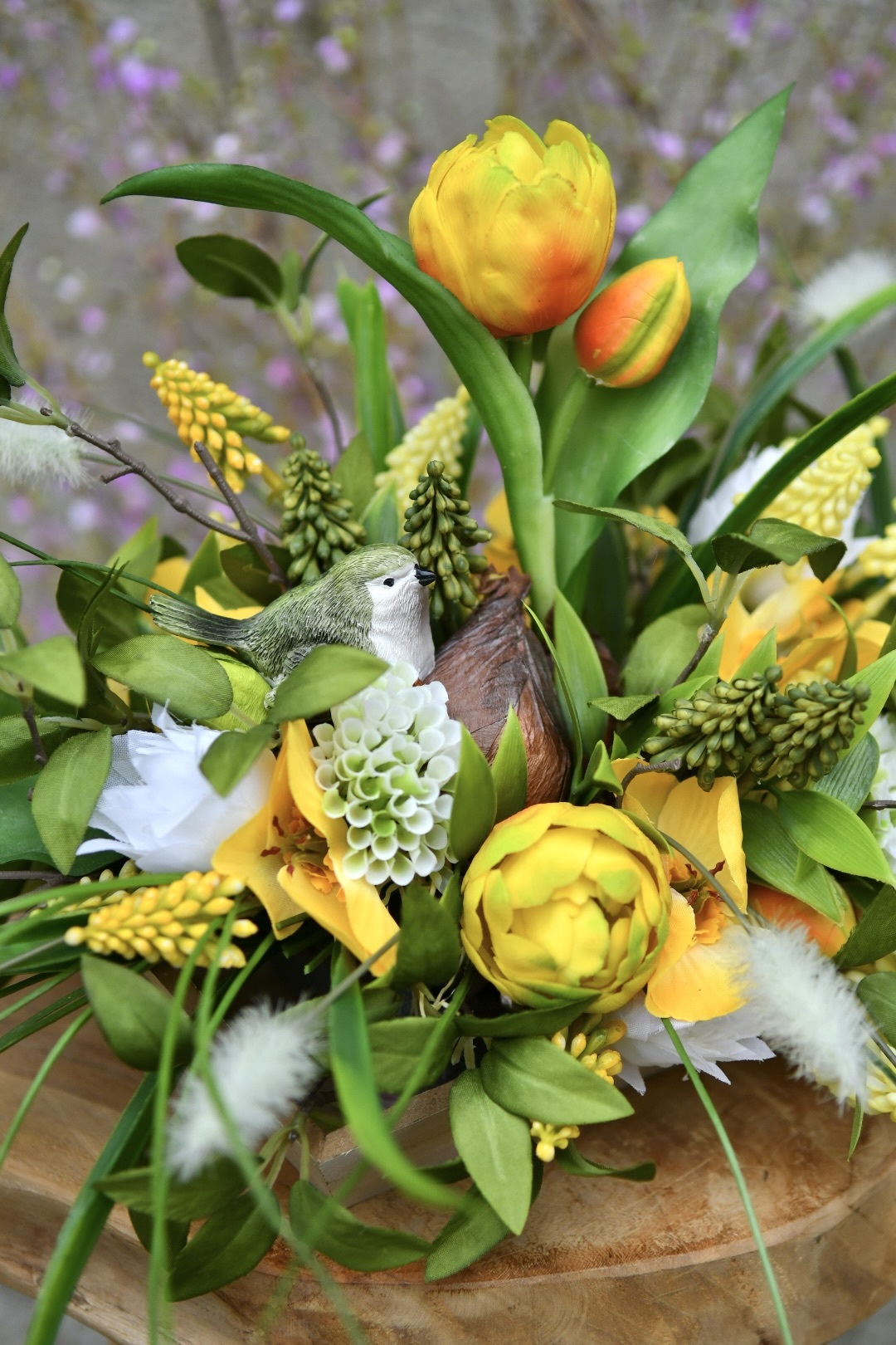 Kompozycję tworzą gumowe tulipany w słonecznym, żółtym kolorze, które nadają całości energii i świeżości. Ich delikatna forma pięknie kontrastuje z bogatą ilością zieleni, która otacza kwiaty, dodając dekoracji lekkości i naturalnego wyglądu.