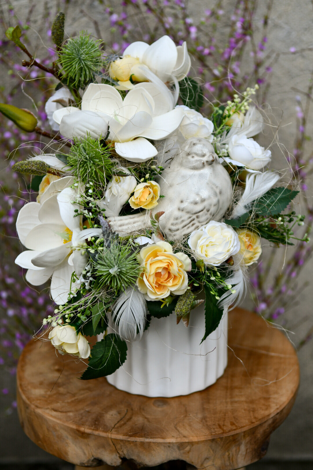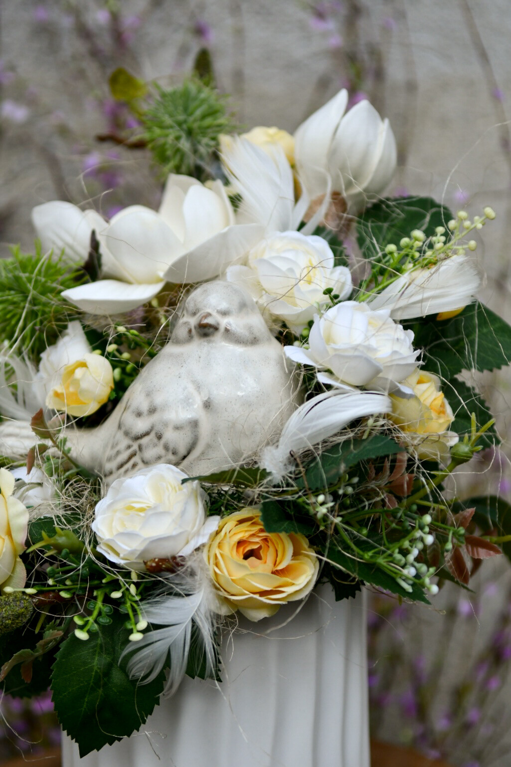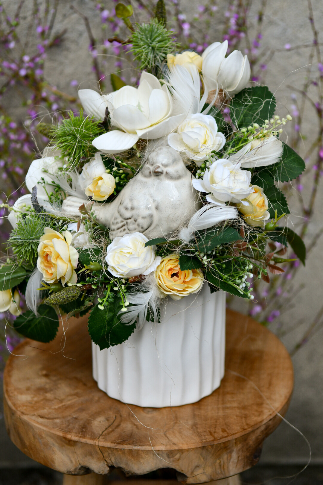 Ta subtelna dekoracja z uroczym ptaszkiem została wykonana w białej, ceramicznej osłonce, która podkreśla jej lekkość i elegancję. Kremowe magnolie w towarzystwie drobnych różyczek w odcieniach kremu i bladego żółtego tworzą harmonijną, świeżą kompozycję – idealną na powitanie wiosny w Twoim domu.