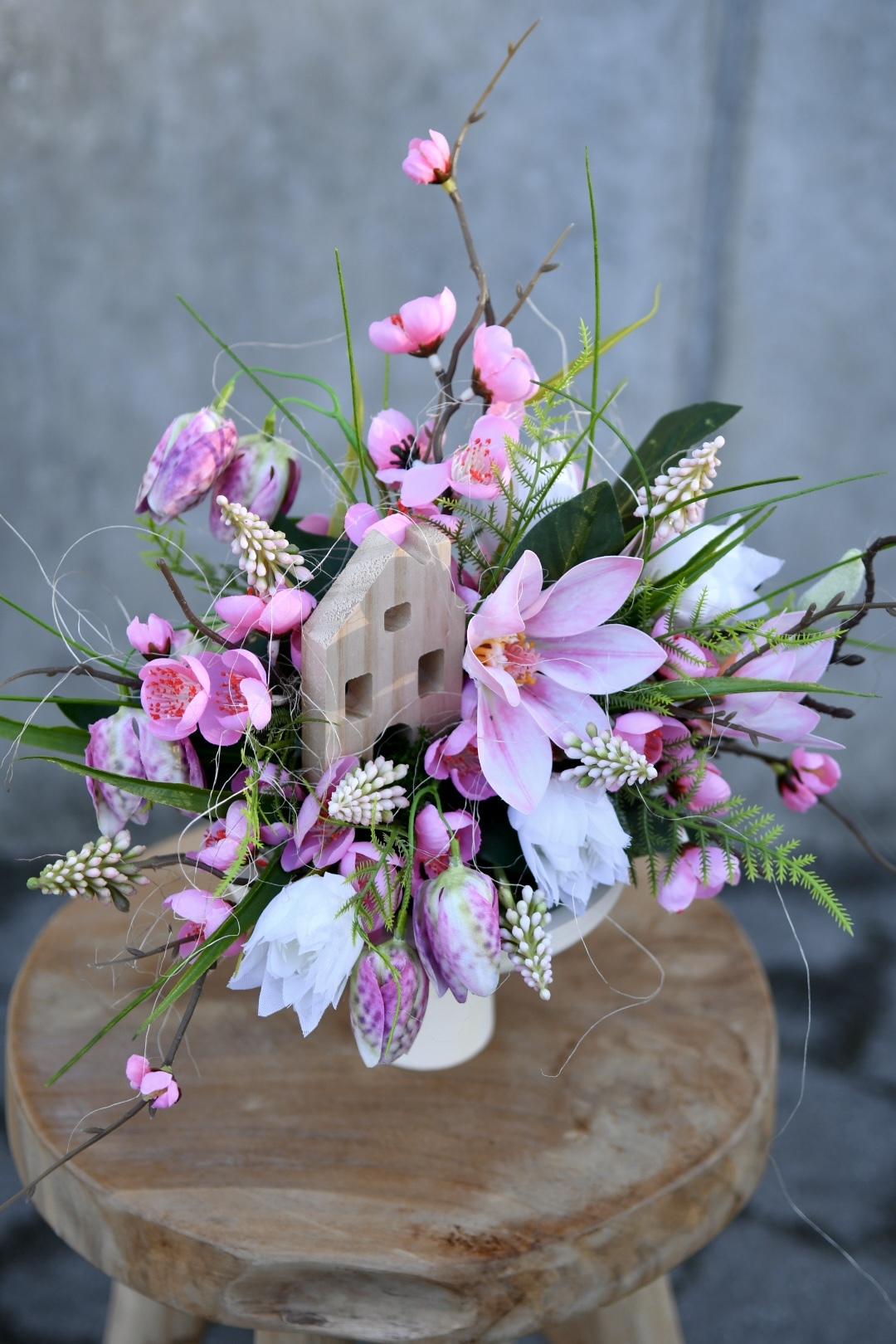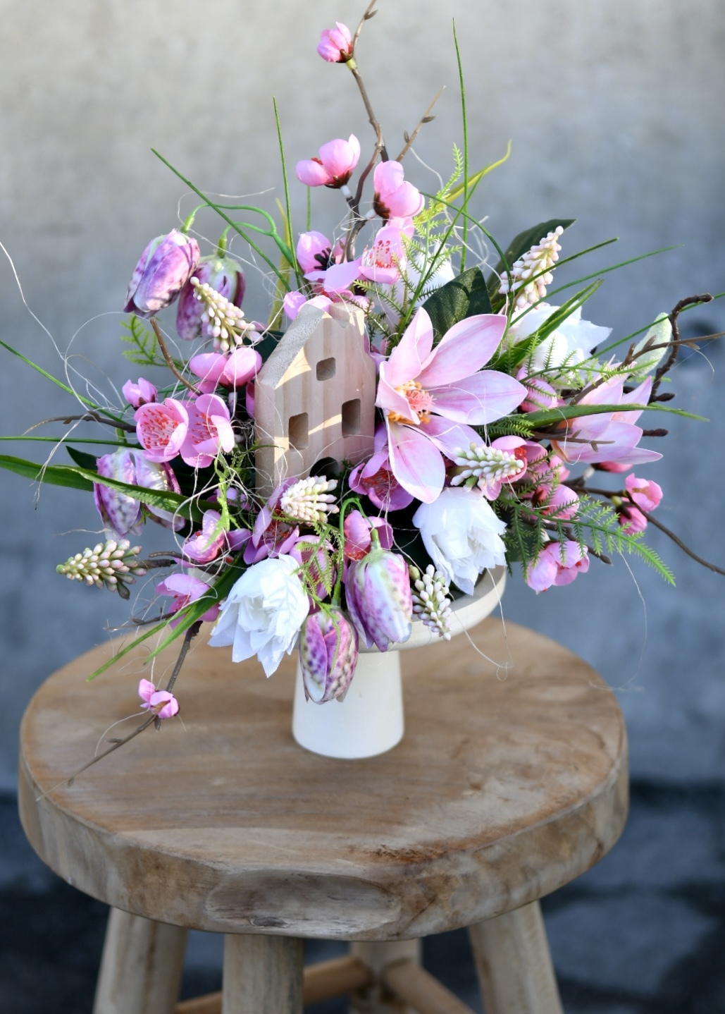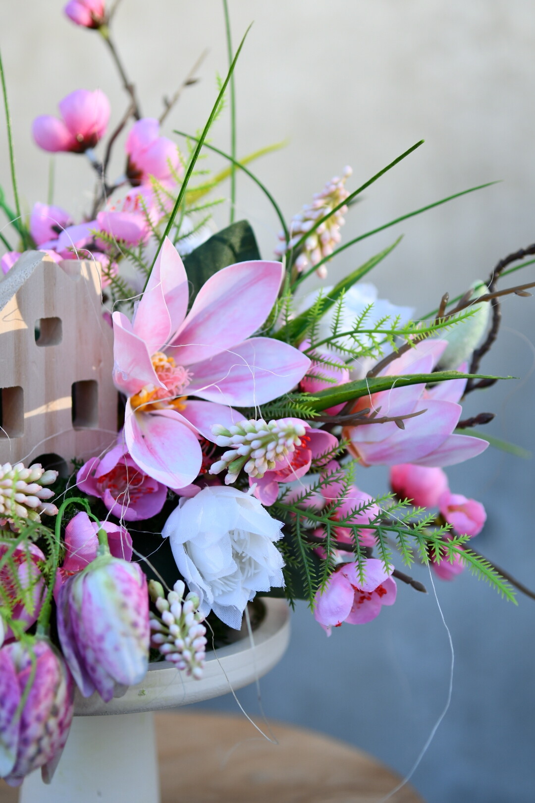 Na delikatnej, kremowej paterze powstała subtelna kompozycja, której sercem jest uroczy drewniany domek. Otaczają go różowe kwiaty w różnych odcieniach – od delikatnego pudrowego różu po bardziej wyraziste akcenty. Całość tworzy lekką, świeżą aranżację, która wprowadza do wnętrza prawdziwie wiosenny klimat.