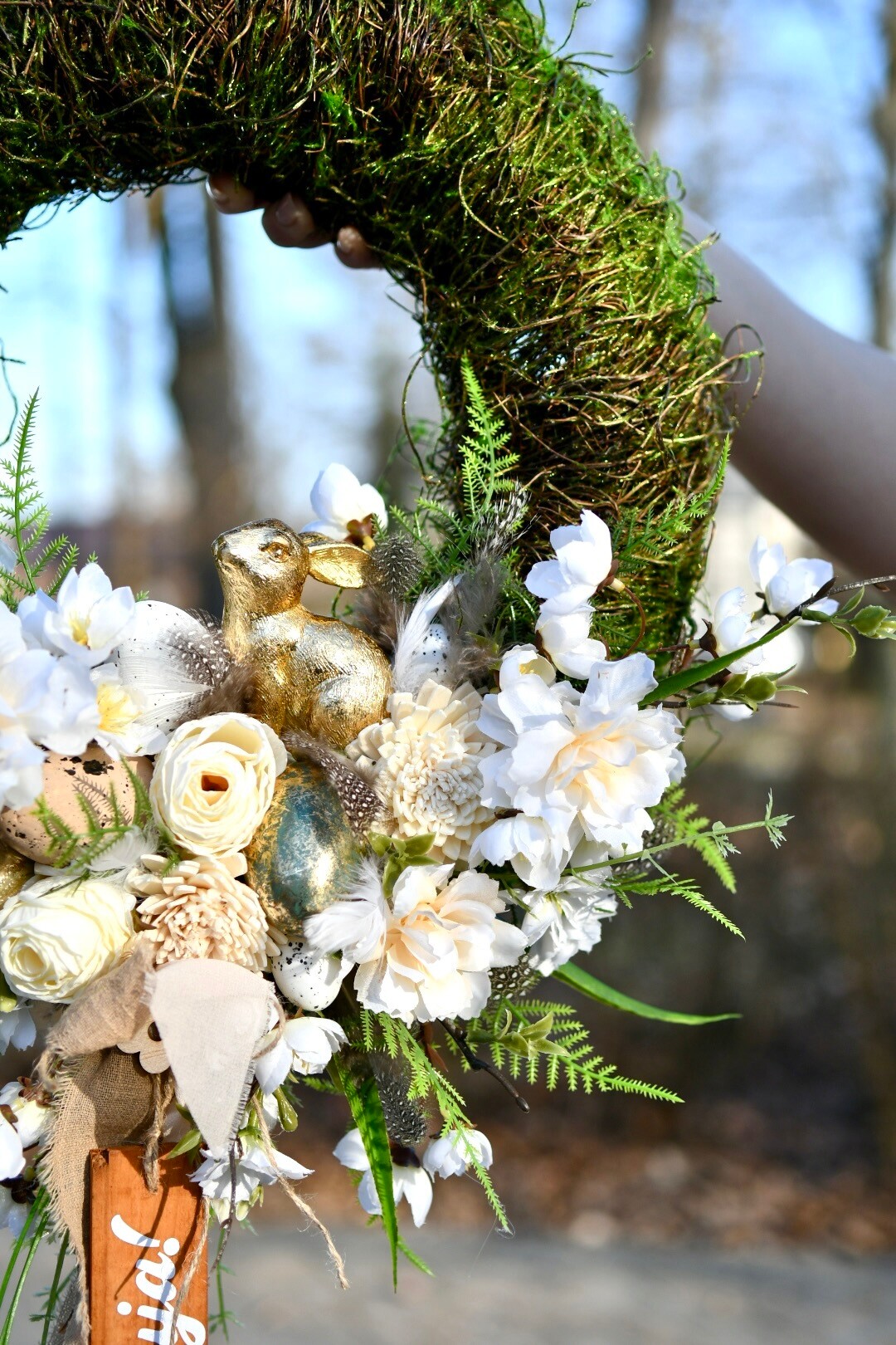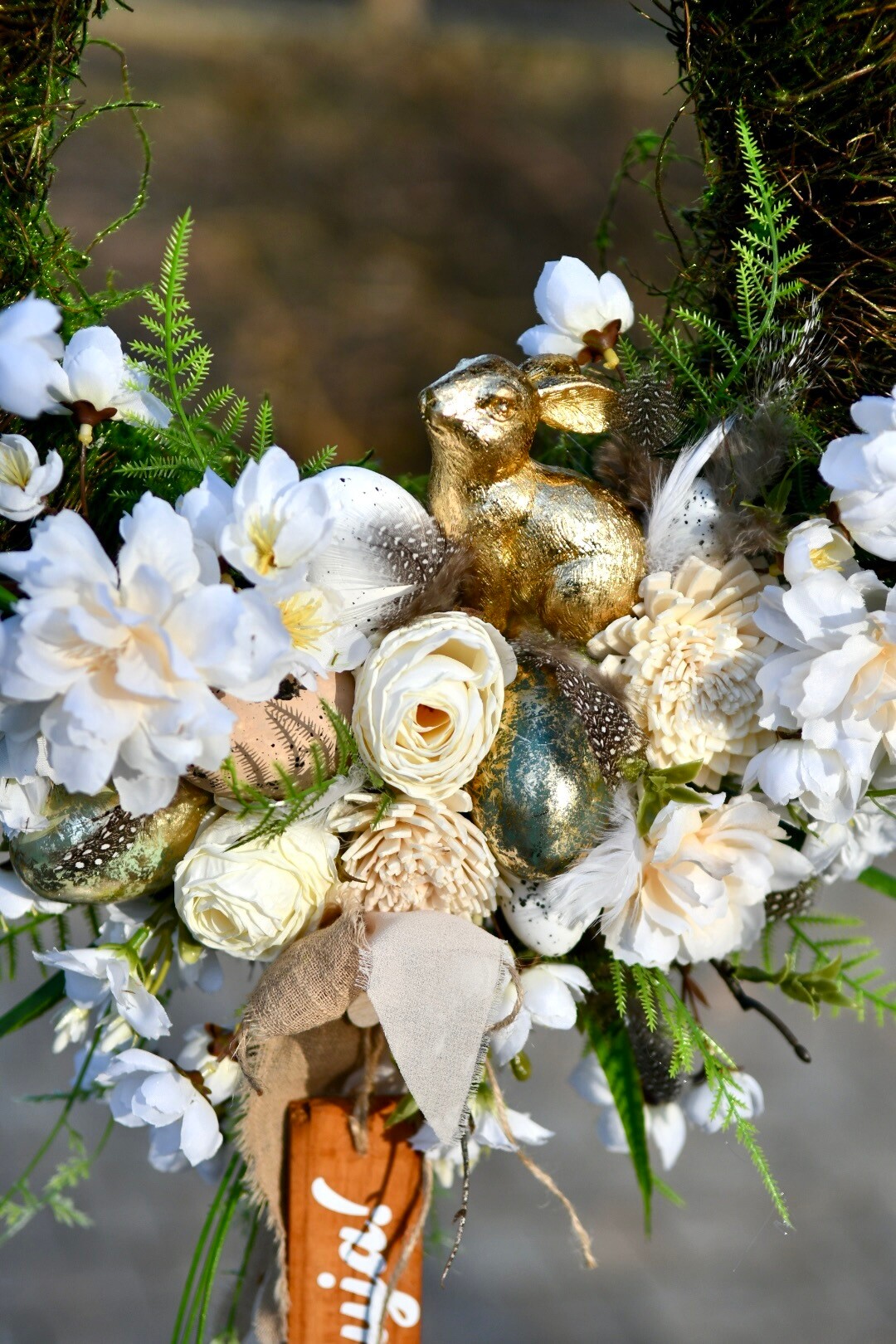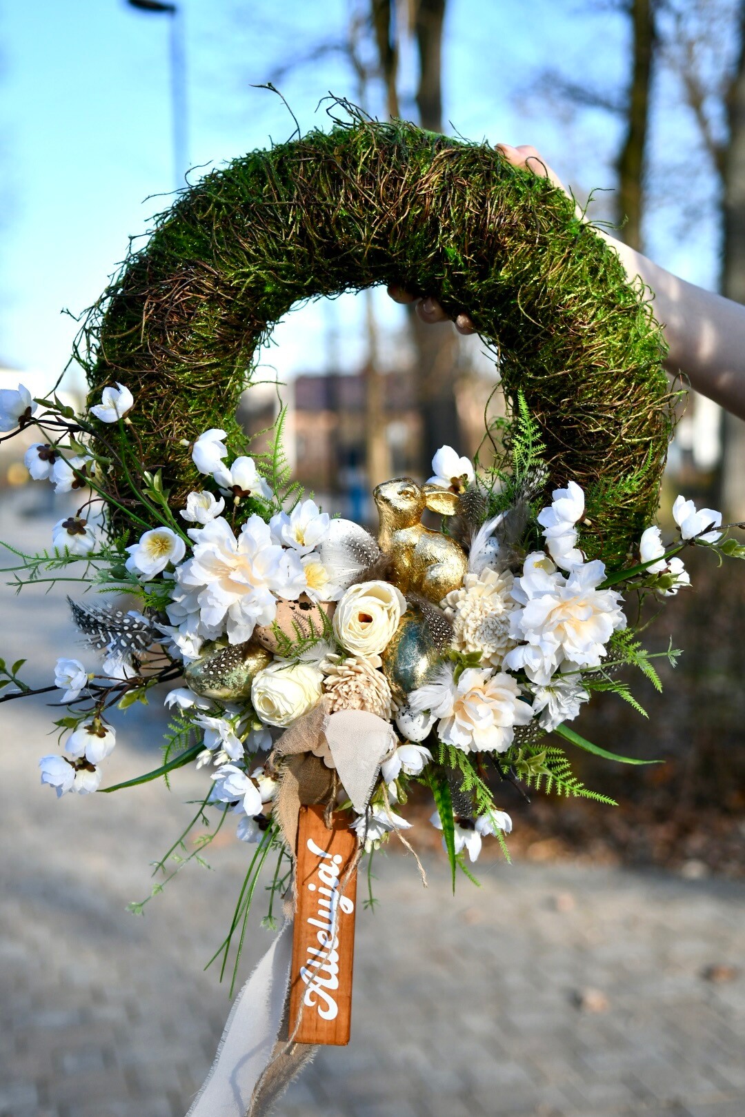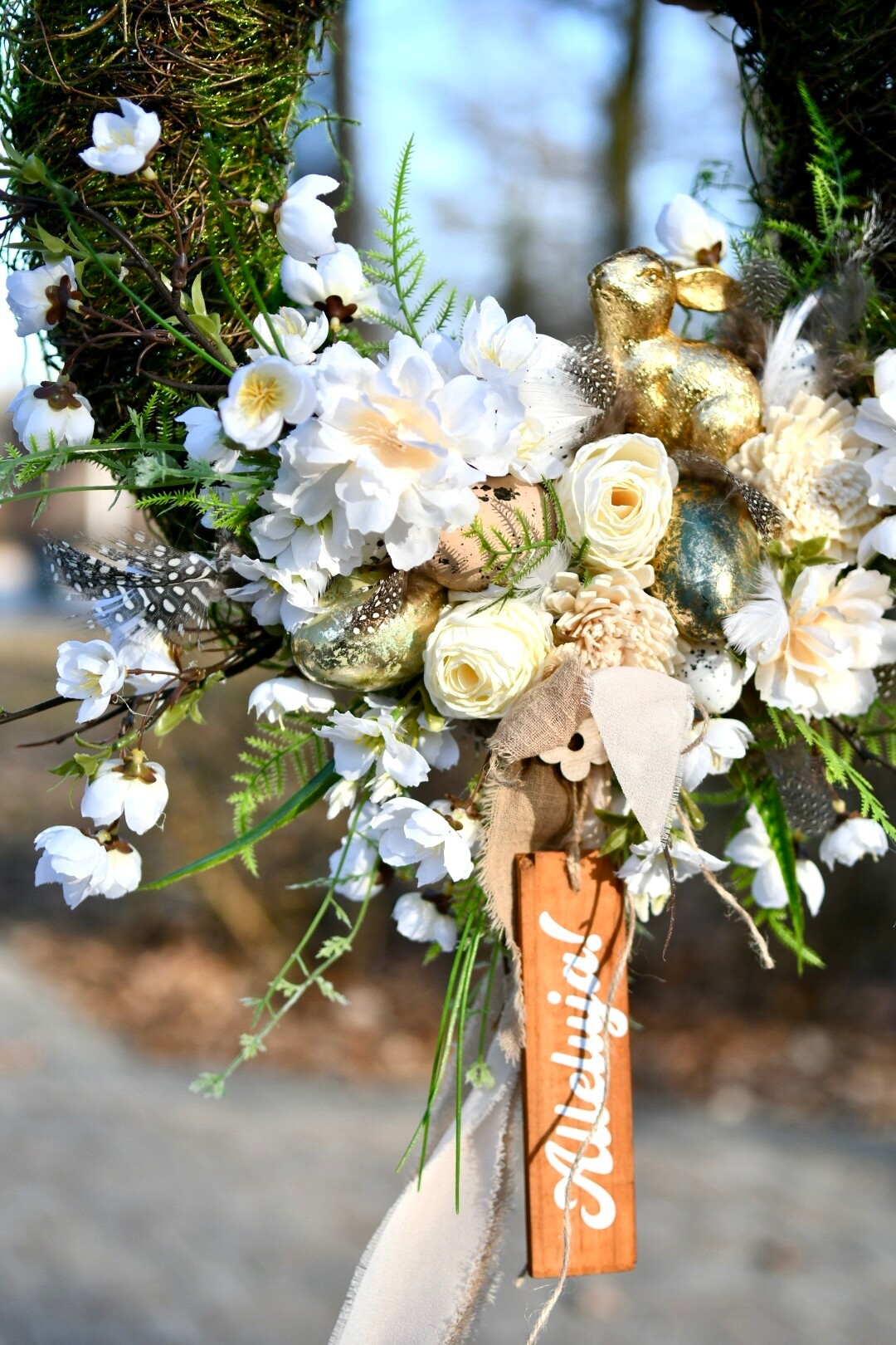 Całość dopełnia zwisająca tabliczka z napisem „Alleluja!”, która nadaje dekoracji wyjątkowego, świątecznego charakteru.