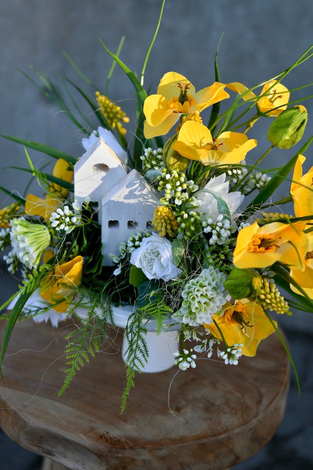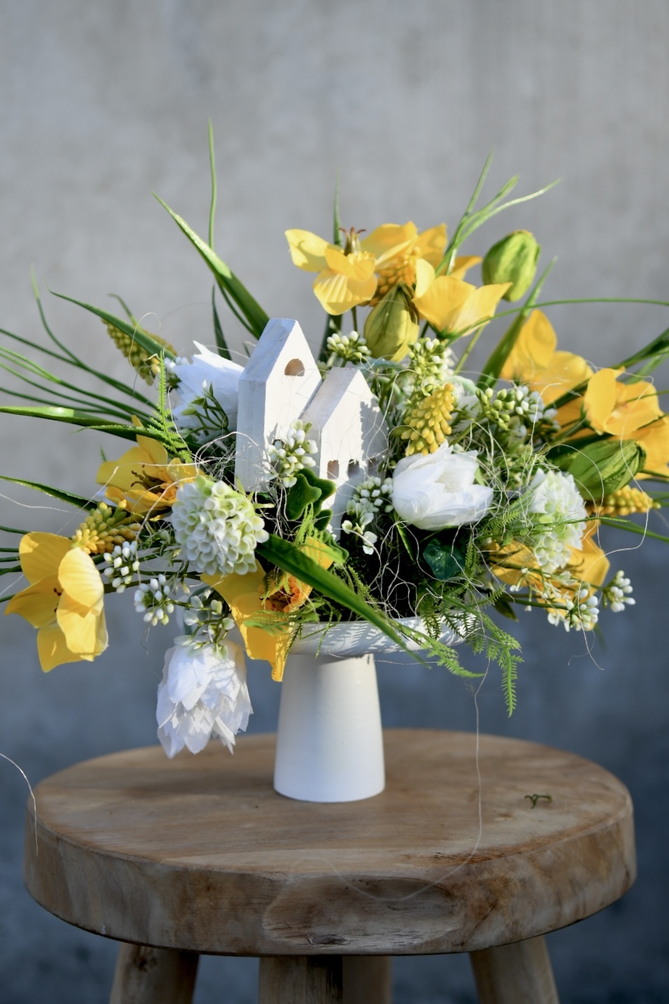 Na eleganckiej, białej paterze powstała radosna kompozycja inspirowana wiosną. Główną ozdobą są urocze drewniane domki, które nadają dekoracji przytulnego, naturalnego charakteru. Całość otaczają piękne kwiaty w różnych odcieniach żółci – symbol słońca, świeżości i budzącej się do życia natury.