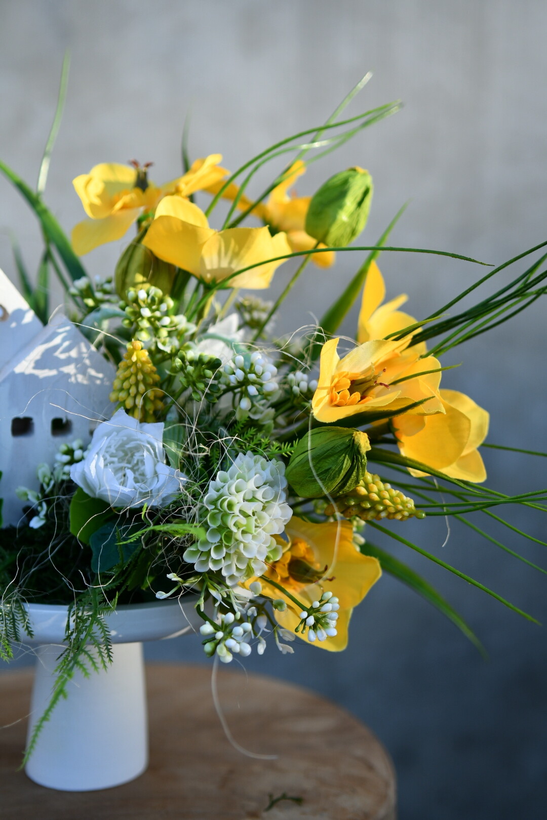 Ta delikatna aranżacja wprowadza do wnętrza ciepły, wiosenny klimat i będzie idealną ozdobą stołu, komody lub parapetu.